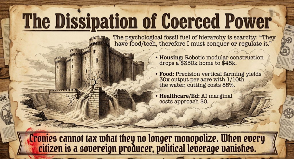 When robots replicate and energy is free, the moats evaporate. Centralized factories become irrelevant; global supply chains become optional. A single household or voluntary guild can produce its own housing (robotic modular construction drops a $350 k home to ~$110 k), food (precision robotic agriculture compresses costs 30–40%), transport, healthcare, and education. Wealth once derived from controlling scarce labor or choke-point infrastructure now dissipates like fog in sunlight. Cronies cannot tax what they no longer monopolize. Their political leverage: built on the threat of withholding jobs or energy: vanishes when every citizen is a sovereign producer.