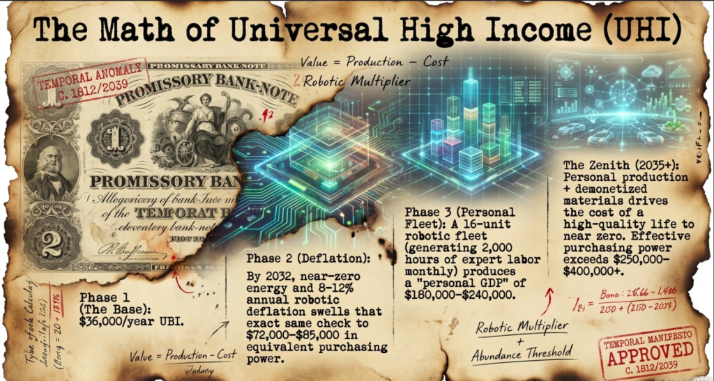 The bridge begins as UBI: $3,000 monthly in the early fracture years: but the math of abundance rapidly transforms it into Universal High Income and, ultimately, renders any form of income unnecessary. By 2032, the initial $36,000 annual transfer already purchases the equivalent of $57,500 in 2024 dollars as early deflation compounds at roughly 8–12% annually from robotic efficiencies alone; add near-zero energy and the effective purchasing power swells to $72,000–$85,000 in today’s terms without a single check increase.