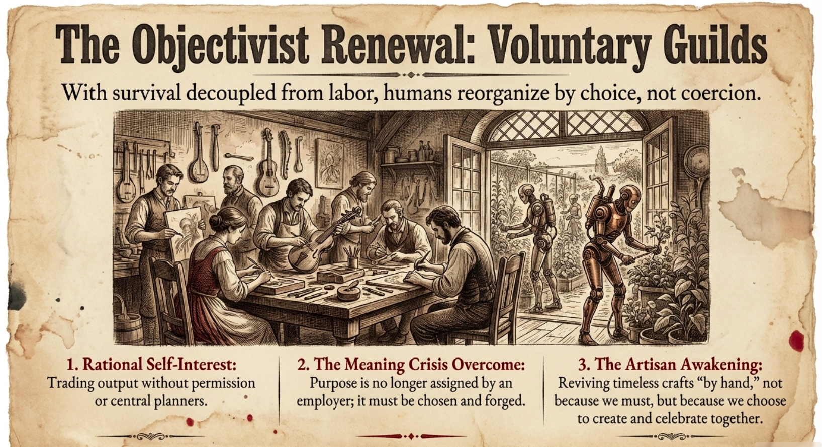 With survival decoupled from labor, humans reorganize by choice, not coercion: the core insight of Objectivism stripped of caricature. Rational self-interest, reason, and voluntary cooperation become the operating system. Cultures and guilds form around shared values, shared projects, shared wonder: artisans reviving timeless crafts “by hand” in the 5000-day series, explorers mapping new frontiers, lovers rediscovering intimacy when robots handle the mundane. No central planner dictates the guilds. No subsidy props them. They arise because free people, no longer exhausted by scarcity’s treadmill, choose to trade, create, and celebrate together.