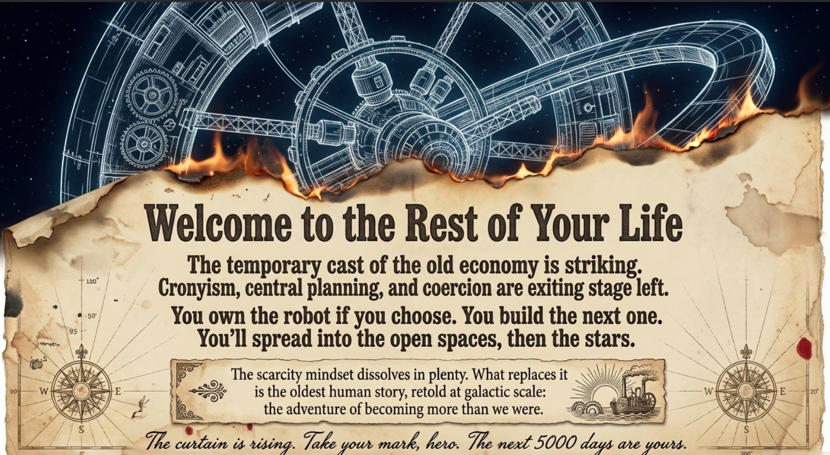 You own the robot if you choose. You build the next one. You spread into the open spaces, then the stars. The scarcity mindset that fueled conquest dissolves in plenty. What replaces it is the oldest human story, retold at galactic scale: the adventure of becoming more than we were.