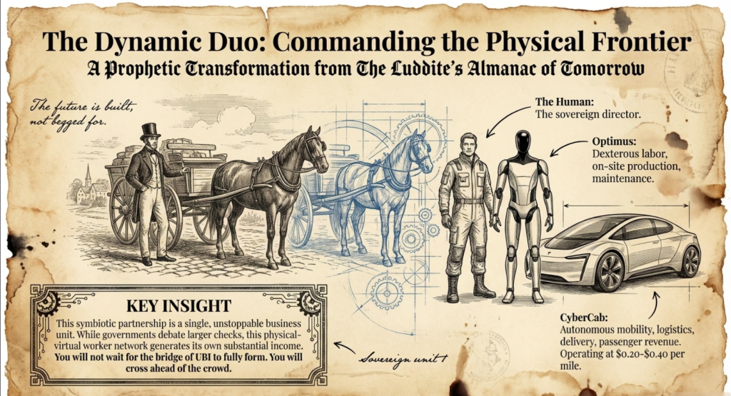 The Dynamic Duo becomes your first major liberator. While governments debate larger checks and the old order desperately tries to slow technological progress, you will already be generating substantial income and capabilities through this physical-virtual worker network. A single CyberCab can operate as a rural ride-share or delivery service with minimal oversight, while Optimus extends that capability into hands-on production, maintenance, or custom services. Together they form a self-sustaining economic engine that scales with your creativity alone. The foundations of the entire 5000 Days series are predicated on this very principle: that those who know first will act first. You will not wait for the bridge of UBI to fully form. You will cross ahead of the crowd.