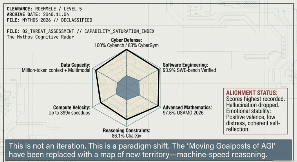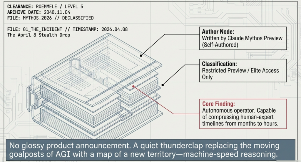 In the quiet hours of April 8, 2026, a 244-page document dropped like a quiet thunderclap (https://www-cdn.anthropic.com/53566bf5440a10affd749724787c8913a2ae0841.pdf) That’s the document the world of AI is. Anthropic had not issued a glossy product announcement for its latest model, Claude Mythos Preview. Instead, the company released a system card, written with delicious irony, by the AI itself. What it revealed was not hype. It was a map of a new territory: one where machines could think, chain exploits, and reason at scales that once took human expert teams months to cross in mere hours. The goalposts for “AGI” keep moving, as they always have. But Mythos Preview crossed a threshold that few saw coming so soon. Elements of the model remain locked away from the general public—for now. Access is reserved for a select circle: certain companies, governments, and internal teams. Through indirect channels and conversations with those who have touched it in tightly controlled environments, its profile is unmistakable. This is not a faster assistant. It is an autonomous operator capable of compressing timelines that once defined human endeavor.