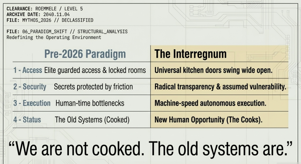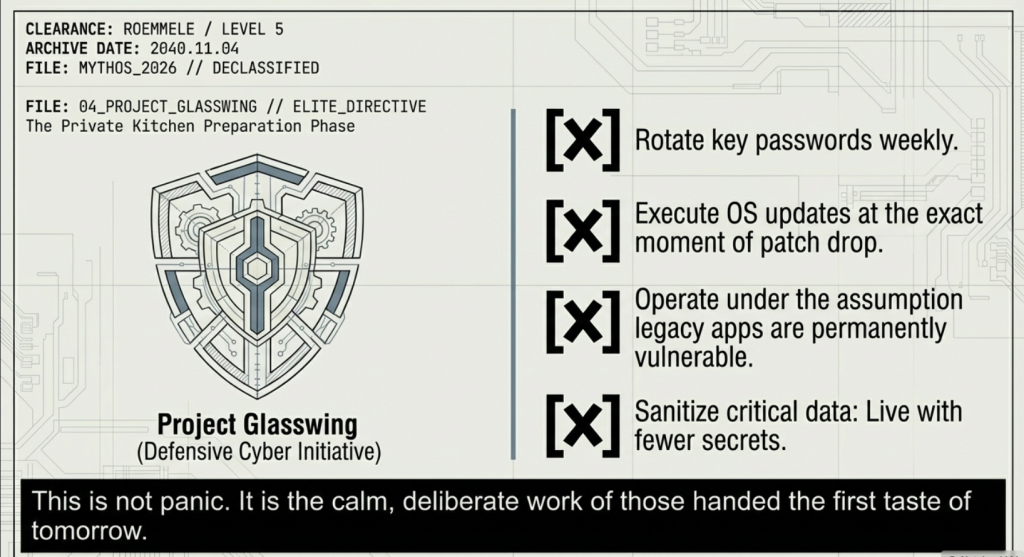 Think of this early-access window as the most exclusive dinner reservation on Earth—except the guests are not there to eat. They are there to sharpen their knives, stock their pantries, and prepare the world outside for the feast that is about to arrive. Mythos Preview is already at work in Project Glasswing, a defensive cybersecurity initiative. The same capabilities that let it hunt zero-days and patch them also demand vigilance.