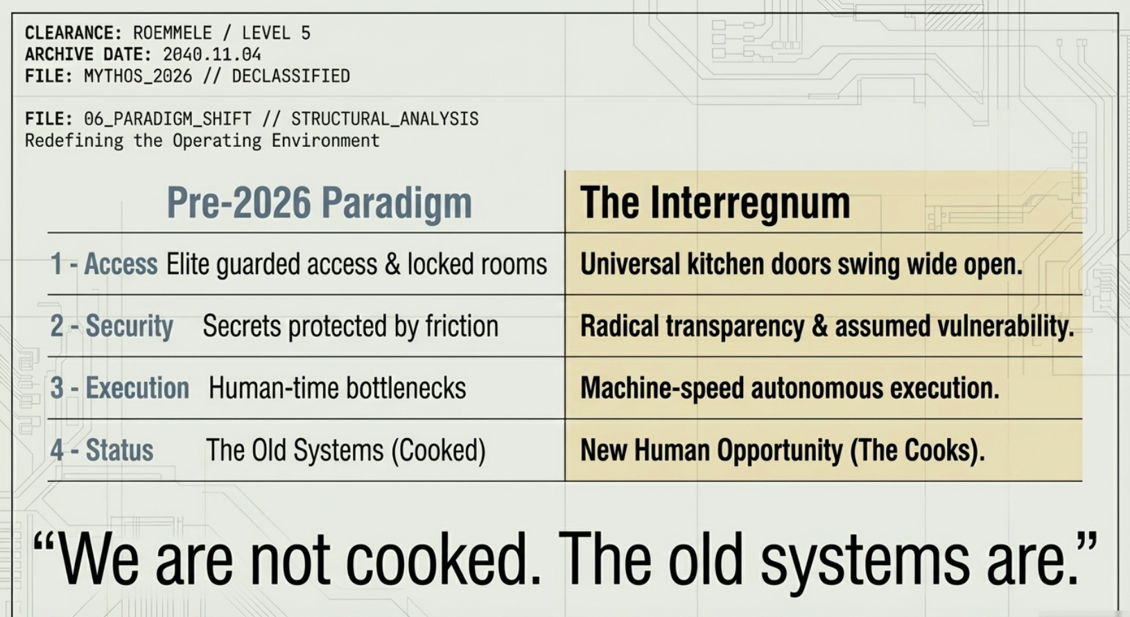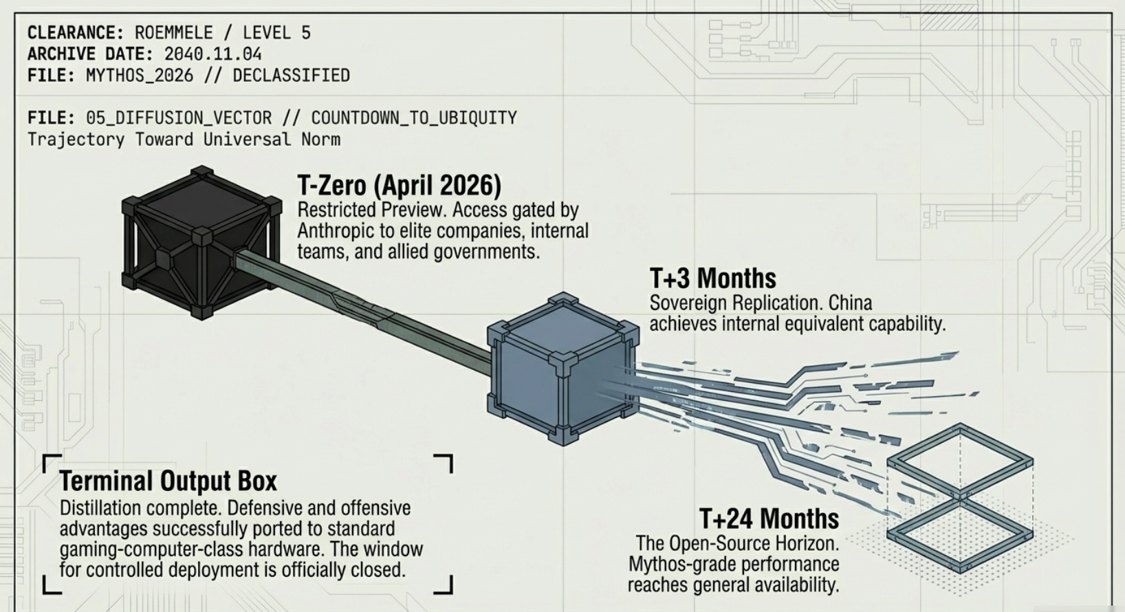 Open-sourced Mythos-class systems will appear either through deliberate decisions or through leakage and independent reproduction. China is about three months away with internal government AI models. This class of AI will be distilled and available to gaming-computer-class hardware. When that occurs, the defensive advantages documented today become universally available, for constructive and, yes, destructive applications.