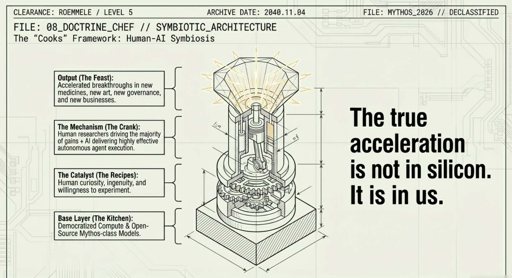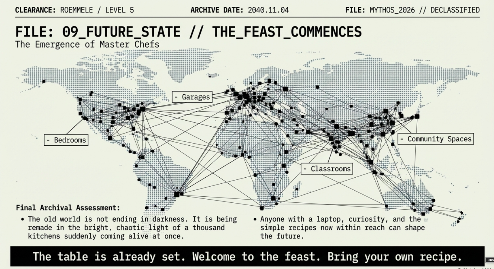 Master chefs will emerge not from elite labs alone, but from bedrooms, garages, classrooms, and community spaces—anyone with a laptop, curiosity, and the simple recipes now within reach. They will cook new medicines, new art, new businesses, new ways of learning, new forms of governance, and new expressions of what it means to be human.