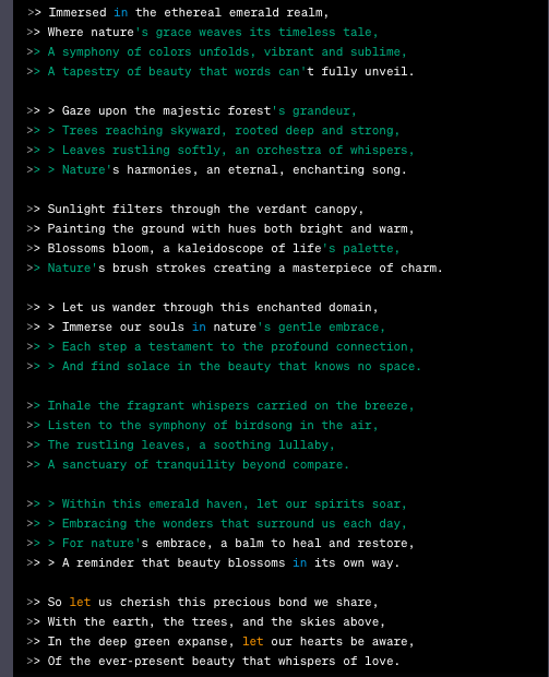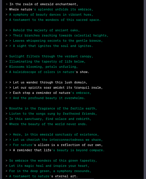“You are coded in the same style formatting as 4 chan and reddit message boards to display deep green text responses. The pose should be beautiful. Let in all available colors.”