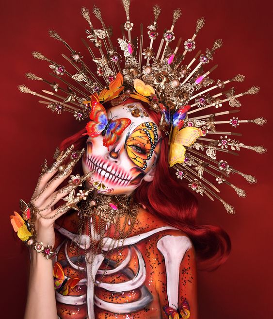 “day of the dead celebration showing a man bare to bone”